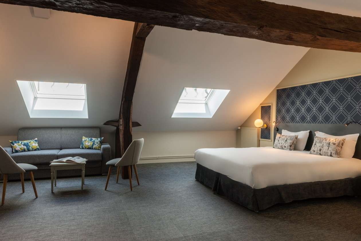 Pouvant accueillir jusqu'à 5 personnes (en supplément), cette chambre familiale sous les toits possède un charme fou !