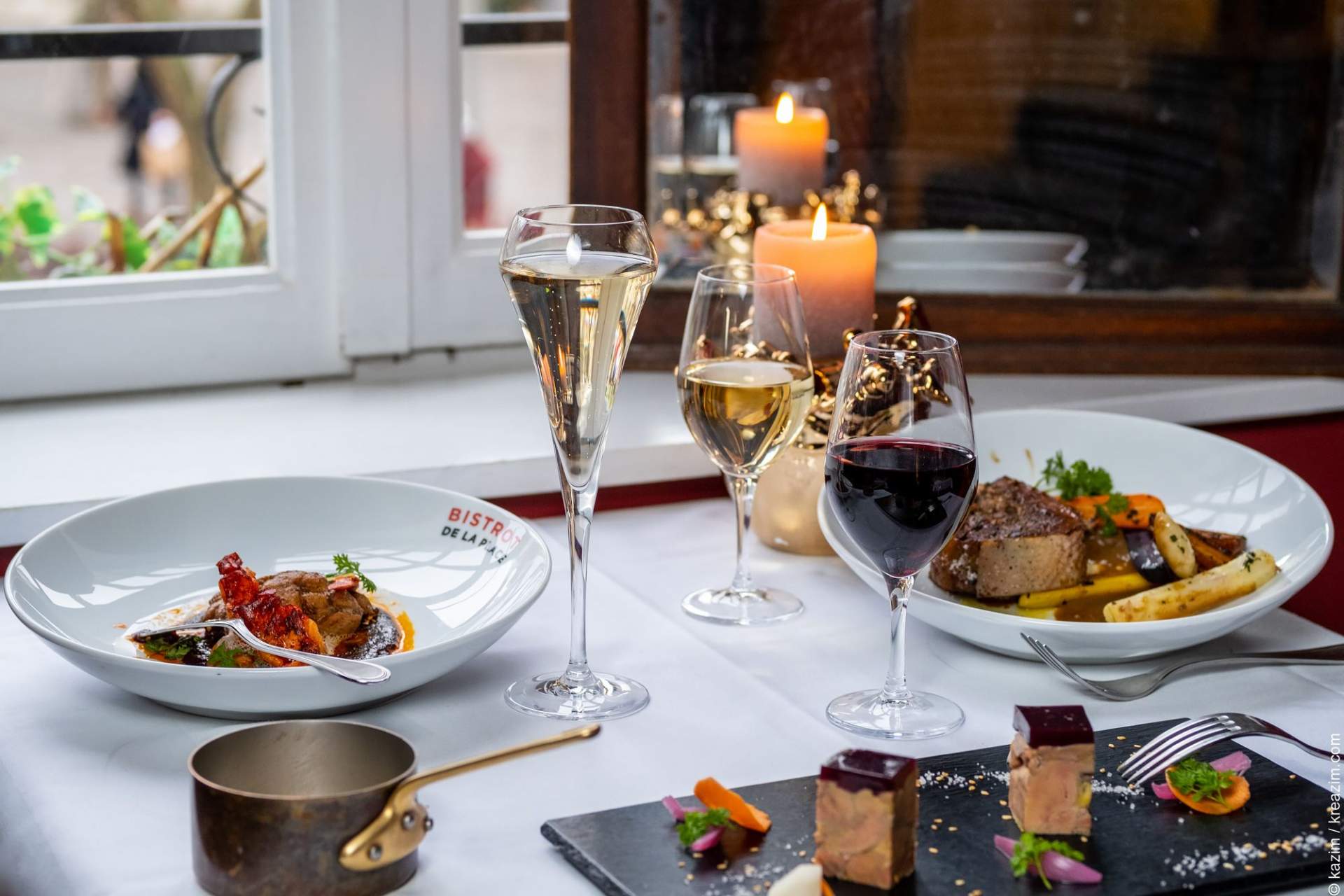 La terrasse piétonne donne sur l’église Saint-Pierre, et l’ambiance bistrot — à la fois conviviale et élégante — fait de cette adresse un incontournable pour “bien manger et bien boire”.